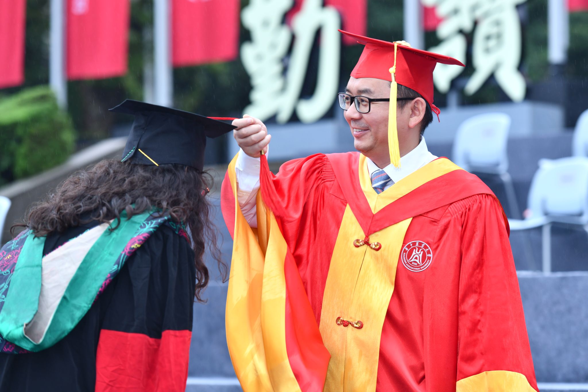 在全体师生齐唱《华中农业大学校歌》声中,学位授予仪式正式开始。姚江林、严建兵、金梅林、青平、李大鹏等为博士学位获得者行拨穗礼。其他校领导、校学位评定委员会委员到相应学院方阵和127校友专区,行拨穗礼。