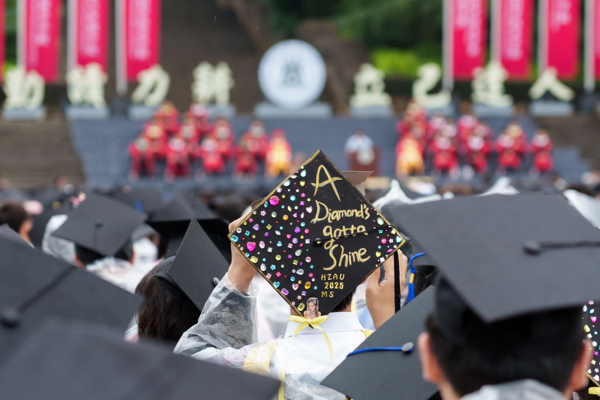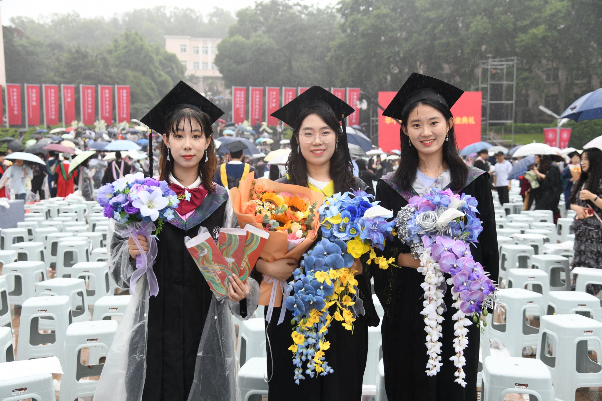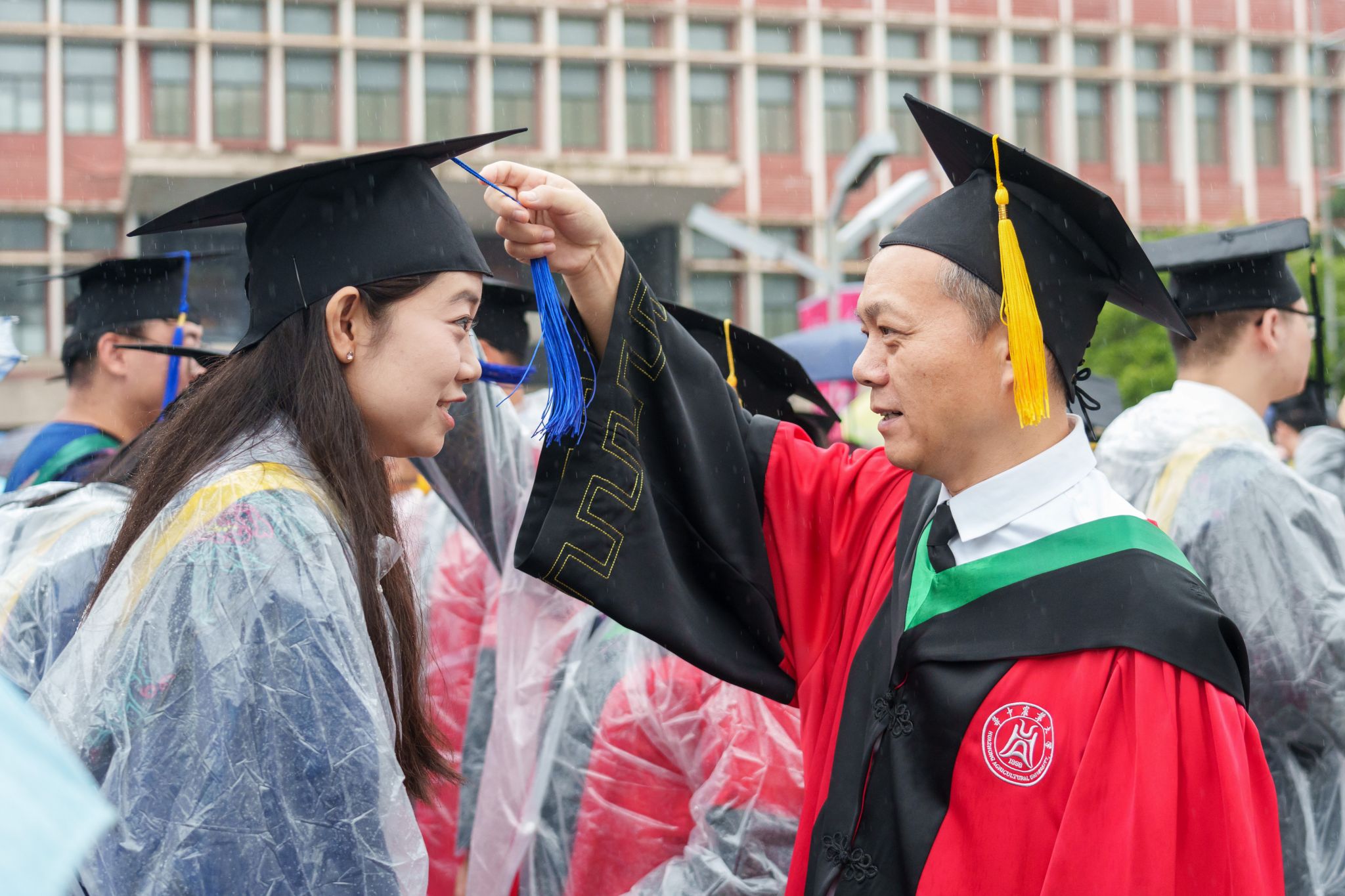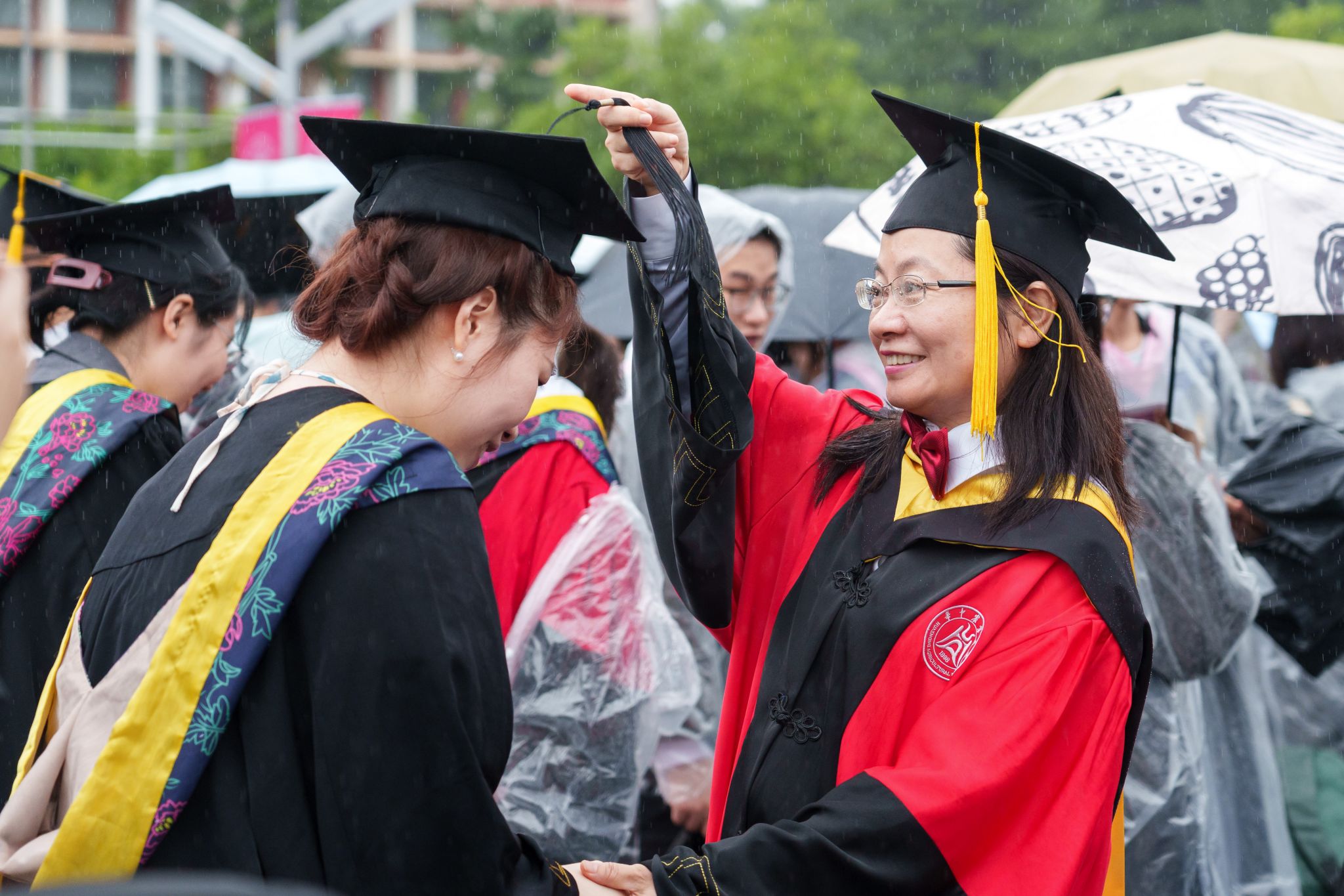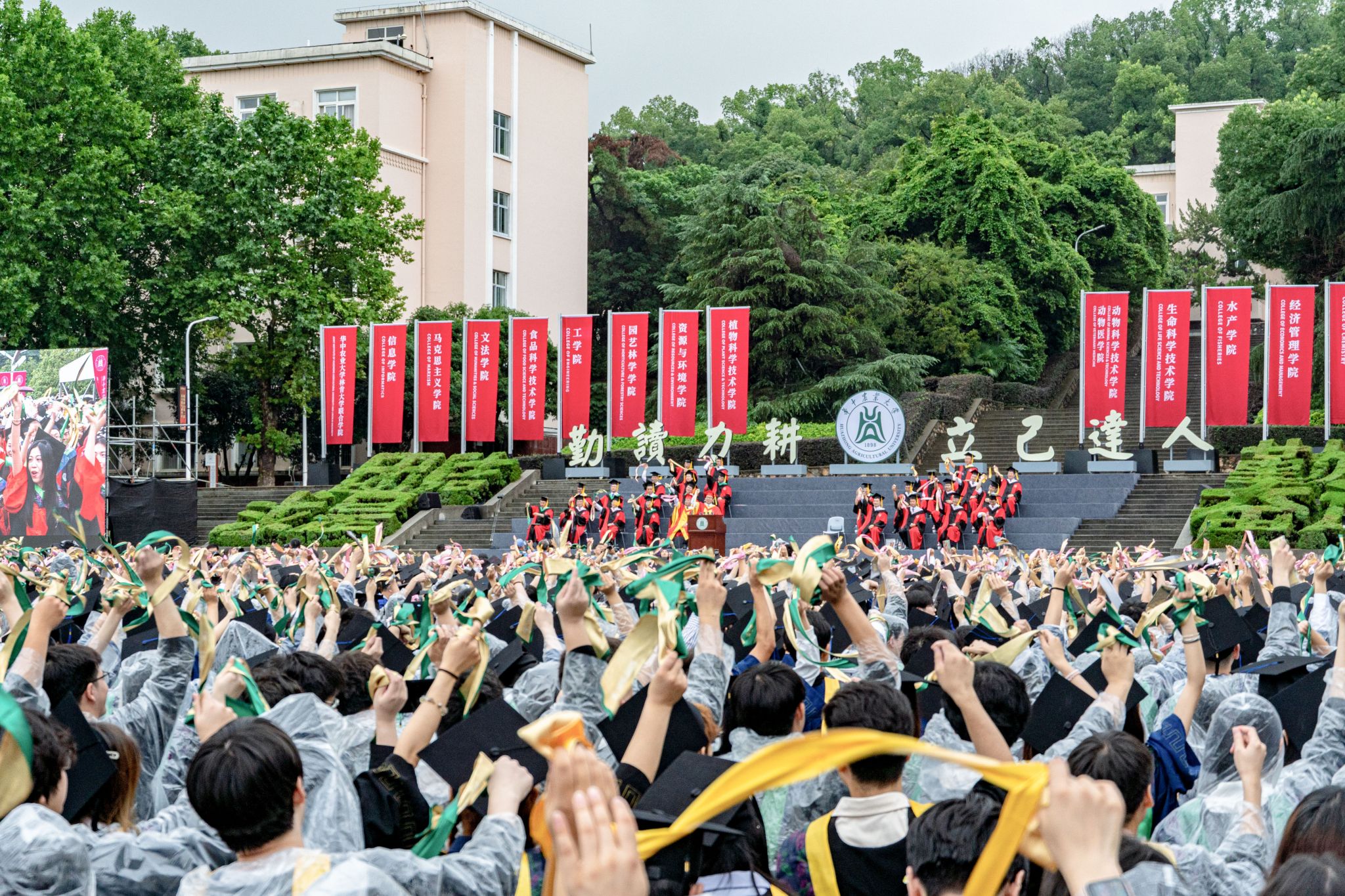 9时30分,仪典在细雨中落下帷幕。毕业生们相互拥抱祝福,他们相约共赴锦程,归来仍是华农少年!