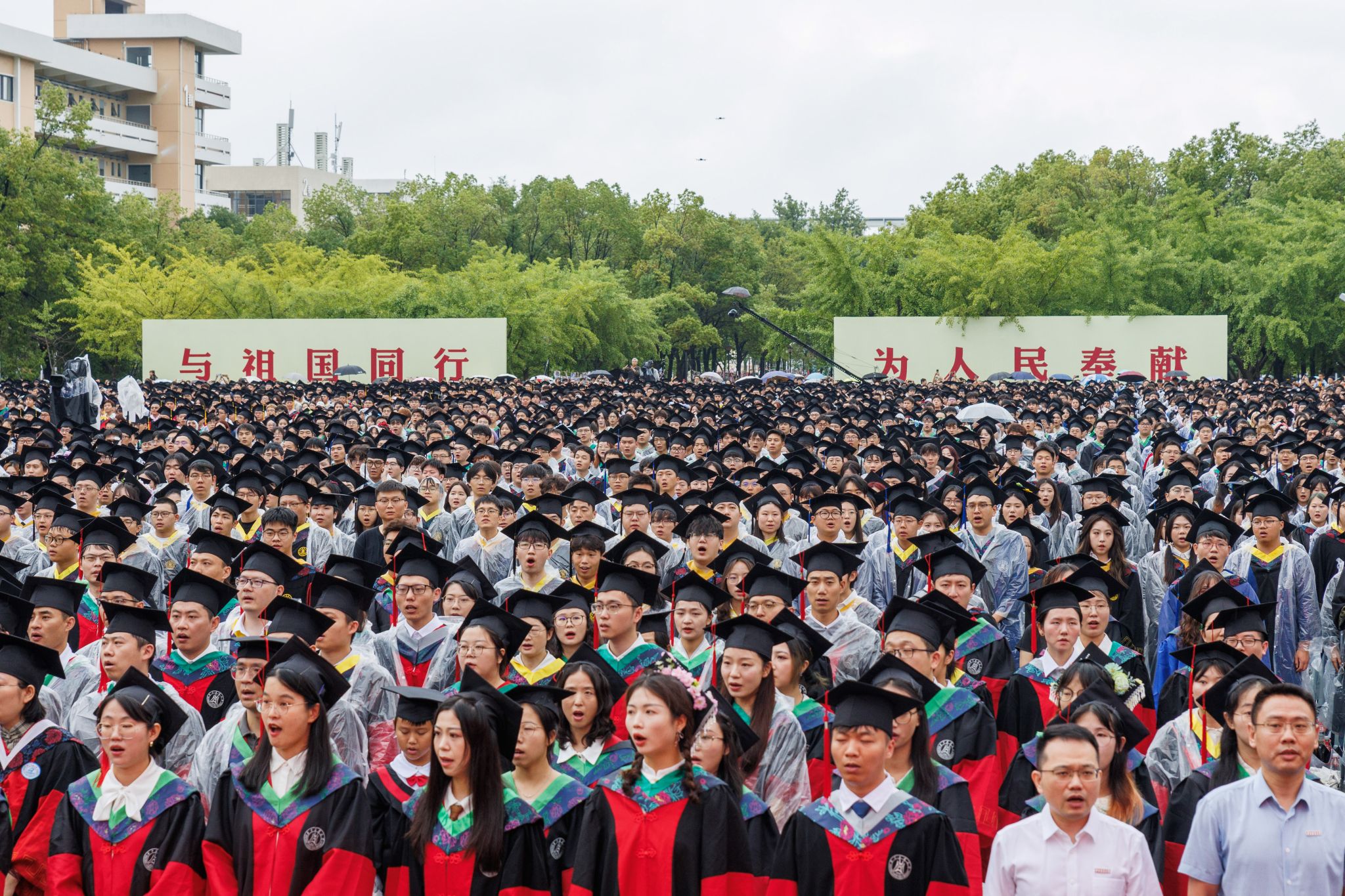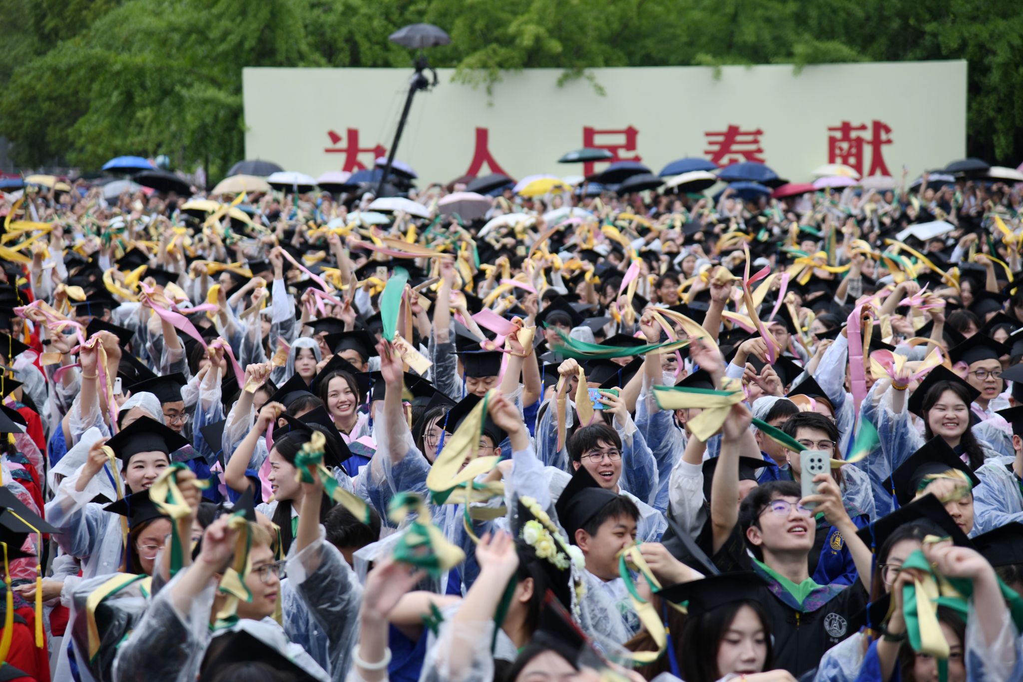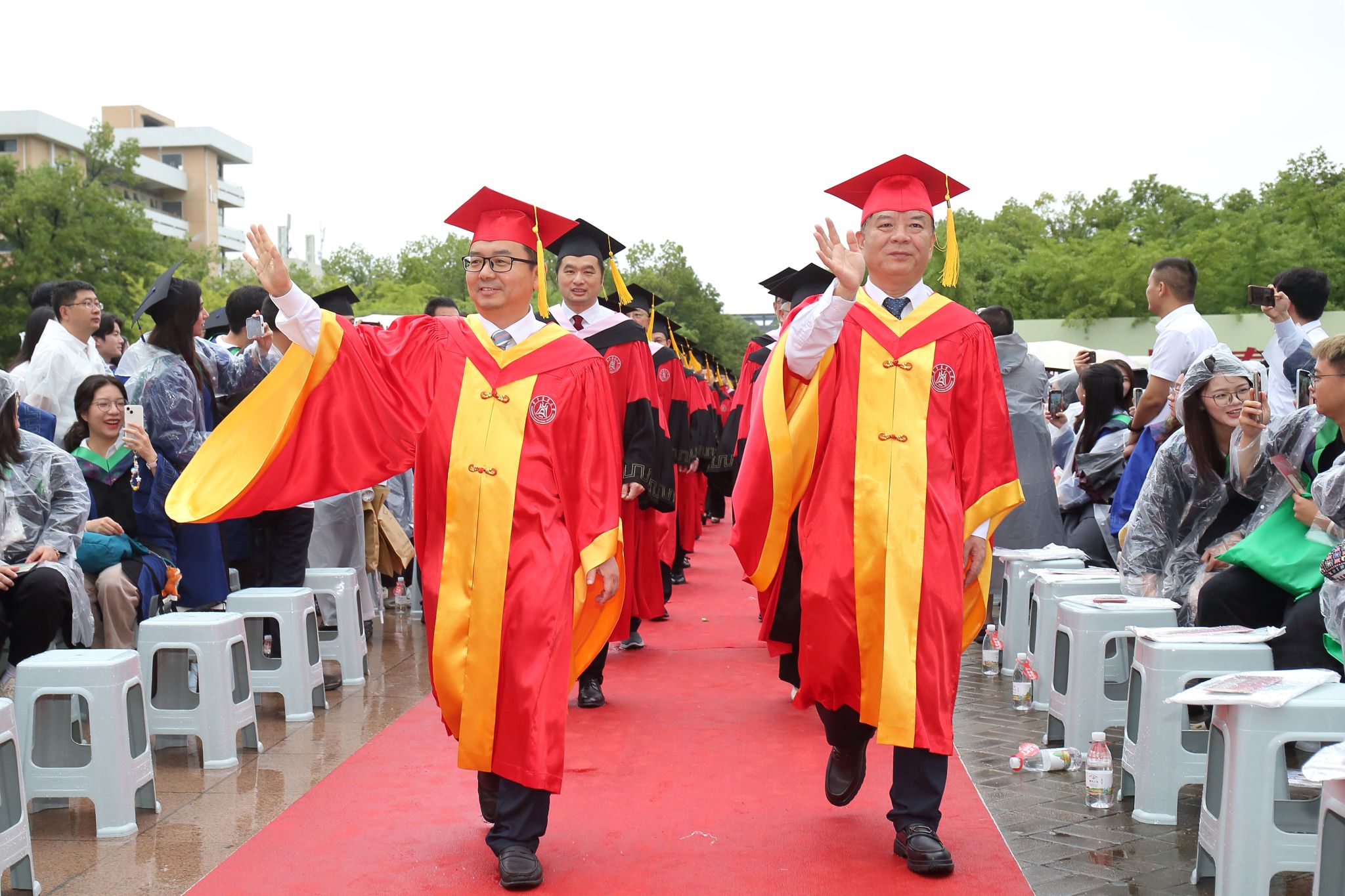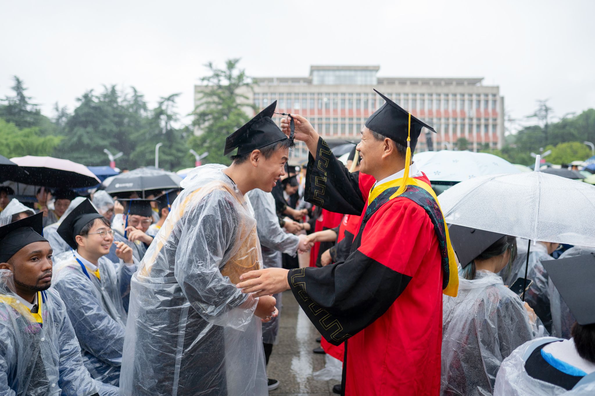 9时30分,仪典在细雨中落下帷幕。毕业生们相互拥抱祝福,他们相约共赴锦程,归来仍是华农少年!