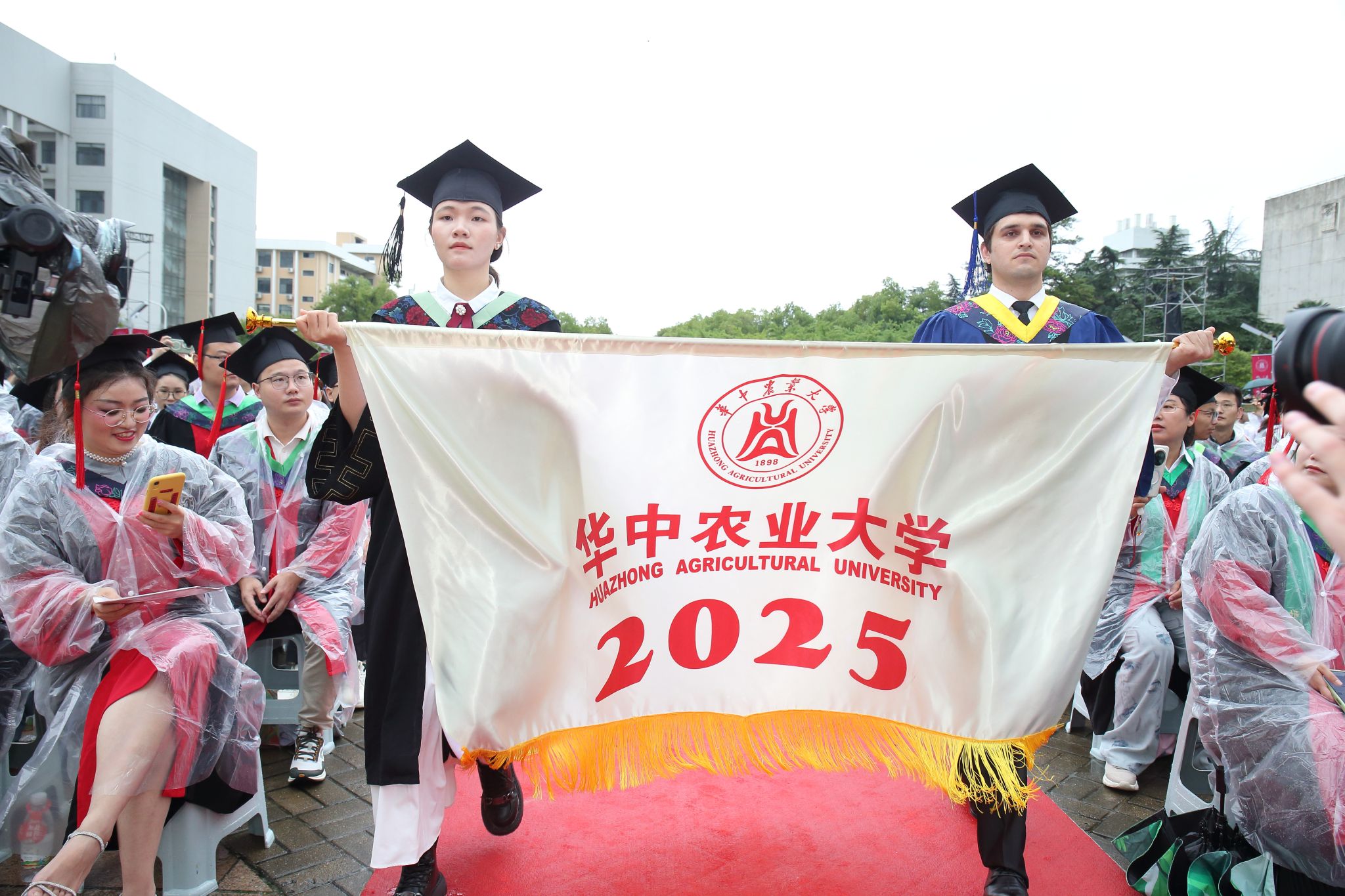 植物科学技术学院植物保护专业2025届本科生舒娜、食品科学技术学院食品科学专业2025届硕士生韩穆德护送毕业旗入场。