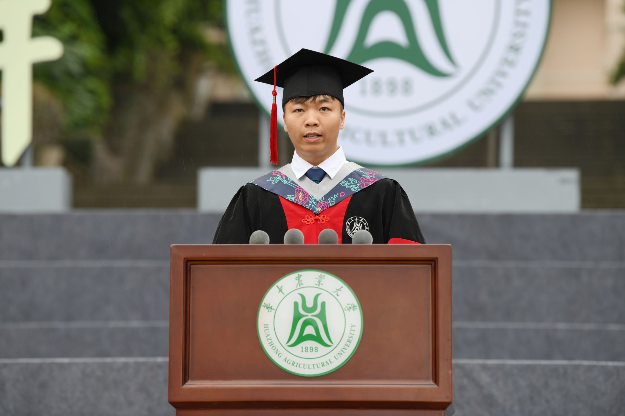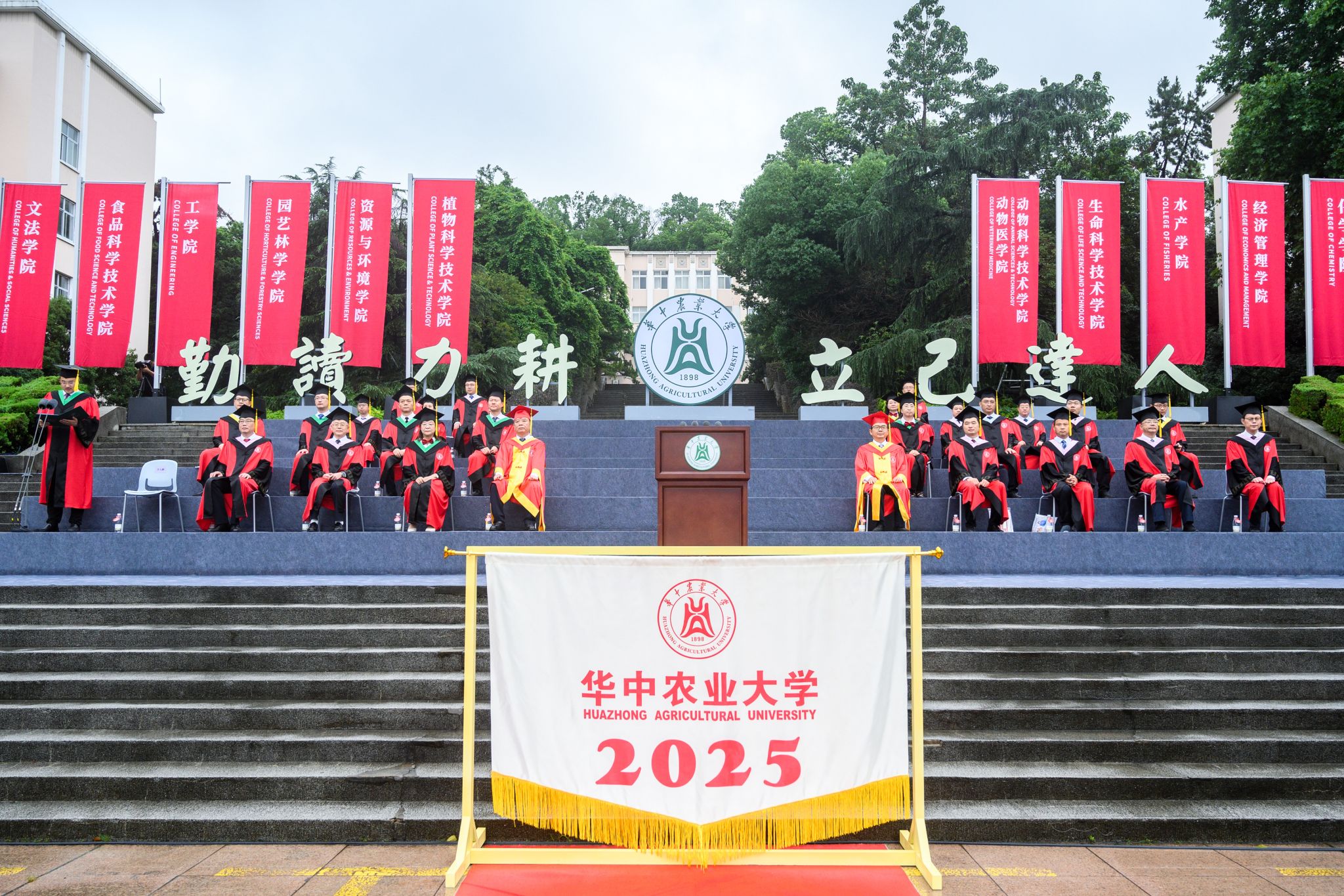 典礼在师生齐唱国歌声中拉开帷幕。校学位评定委员会秘书长、食品科学与工程教授李斌宣读《华中农业大学关于2025年6月授予博士、硕士、学士学位的决定》。